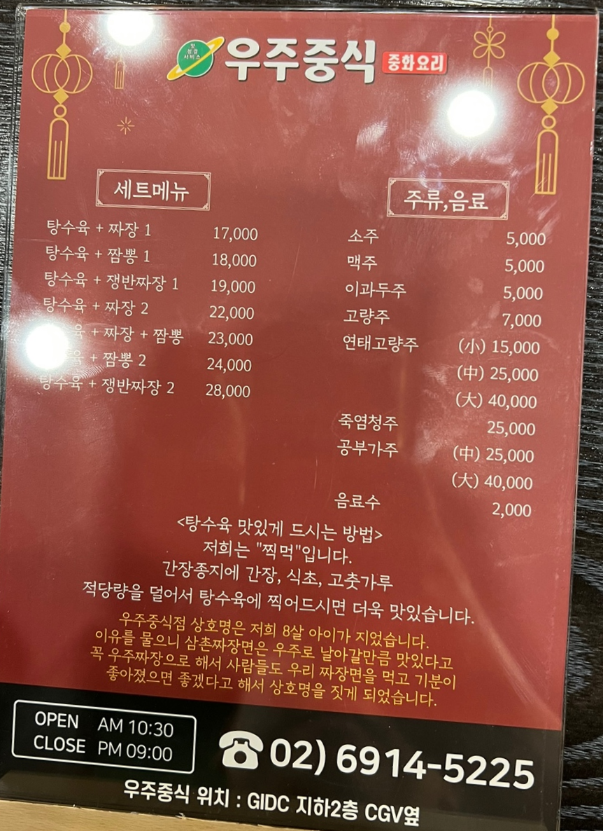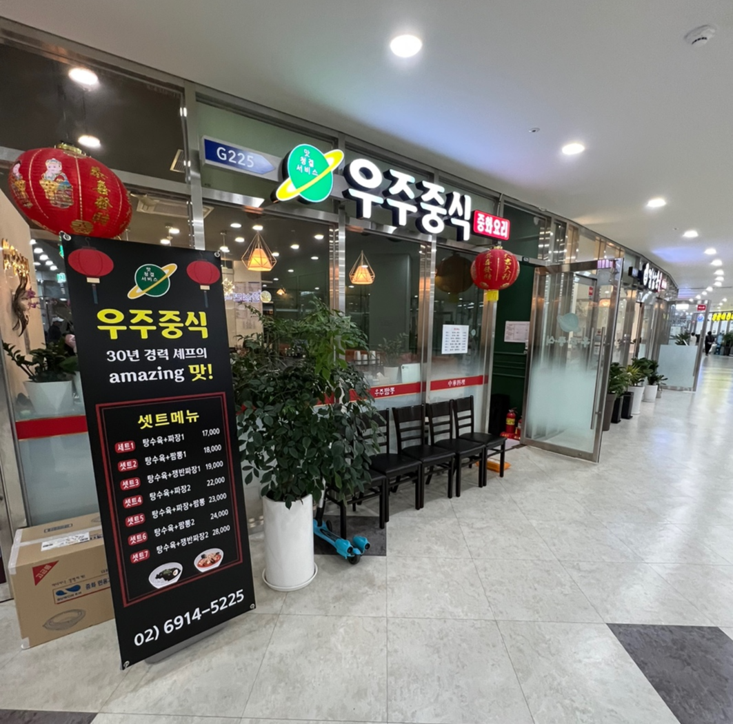 오늘 광명 중앙대병원 바로 앞에 있는 GIDC건물 지하 2층에 위치한 중국집 우주중식에서 점심을 먹었습니다. CGV 옆에 있고 주변에 맛집이 참 많았습니다. 가격도 저렴했고 가성비로 먹을 만한 집인 것 같아서 중앙대병원에 갈 일이 있는 분들은 한번 가보시는 것도 좋을 것 같습니다.