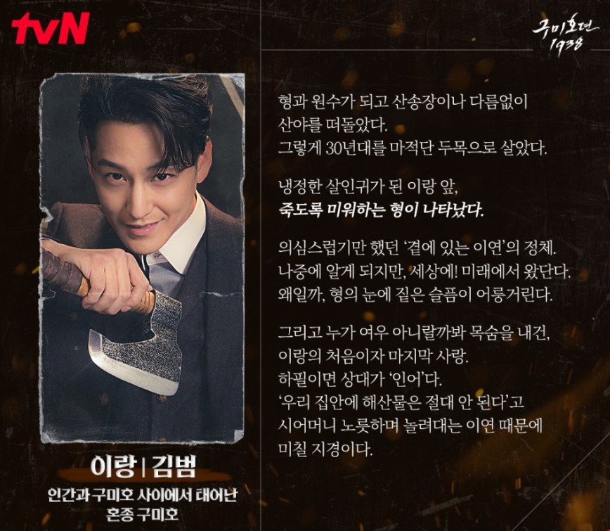 구미호뎐 1938 시즌2가 돌아왔습니다. tvN 토일 드라마 오후 9시 20분에 방영하는 이 드라마는 12부작으로 구성되어 있고 이동욱과 김소연, 김범, 류경수 등 출연진이 화려한데 K판타지 액션 활극이 구미호뎐은 5월 6일 토요일에 첫 방송이 되었습니다.