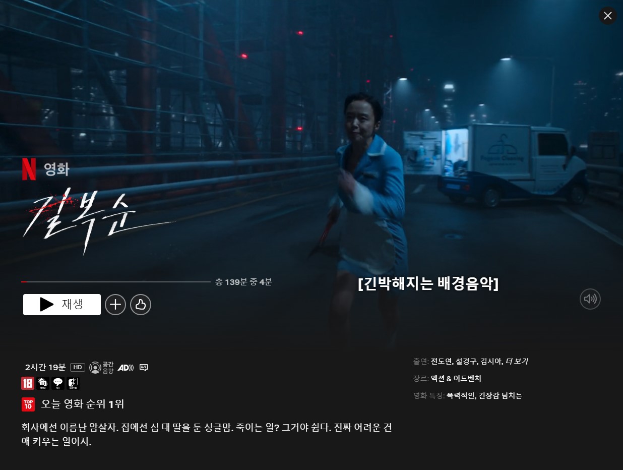 영화 길복순 정보를 간단하게 소개하자면 범죄 액션 누아르 장르로 약간 킬빌 느낌의 영화로 개인적으로 좋아하는 느낌의 영화였습니다. 감독은 영화 <불한당>과 <킹메이커>의 변성현 감독으로 백상예술대상과 대종상 감독상을 수상했던 감독입니다. 3월 31일 오후 5시에 넷플릭스에서 공개되었으며 러닝타임 137분입니다.