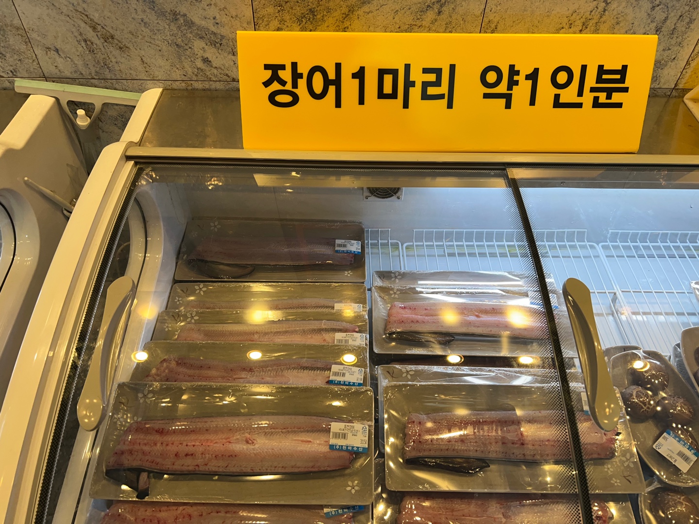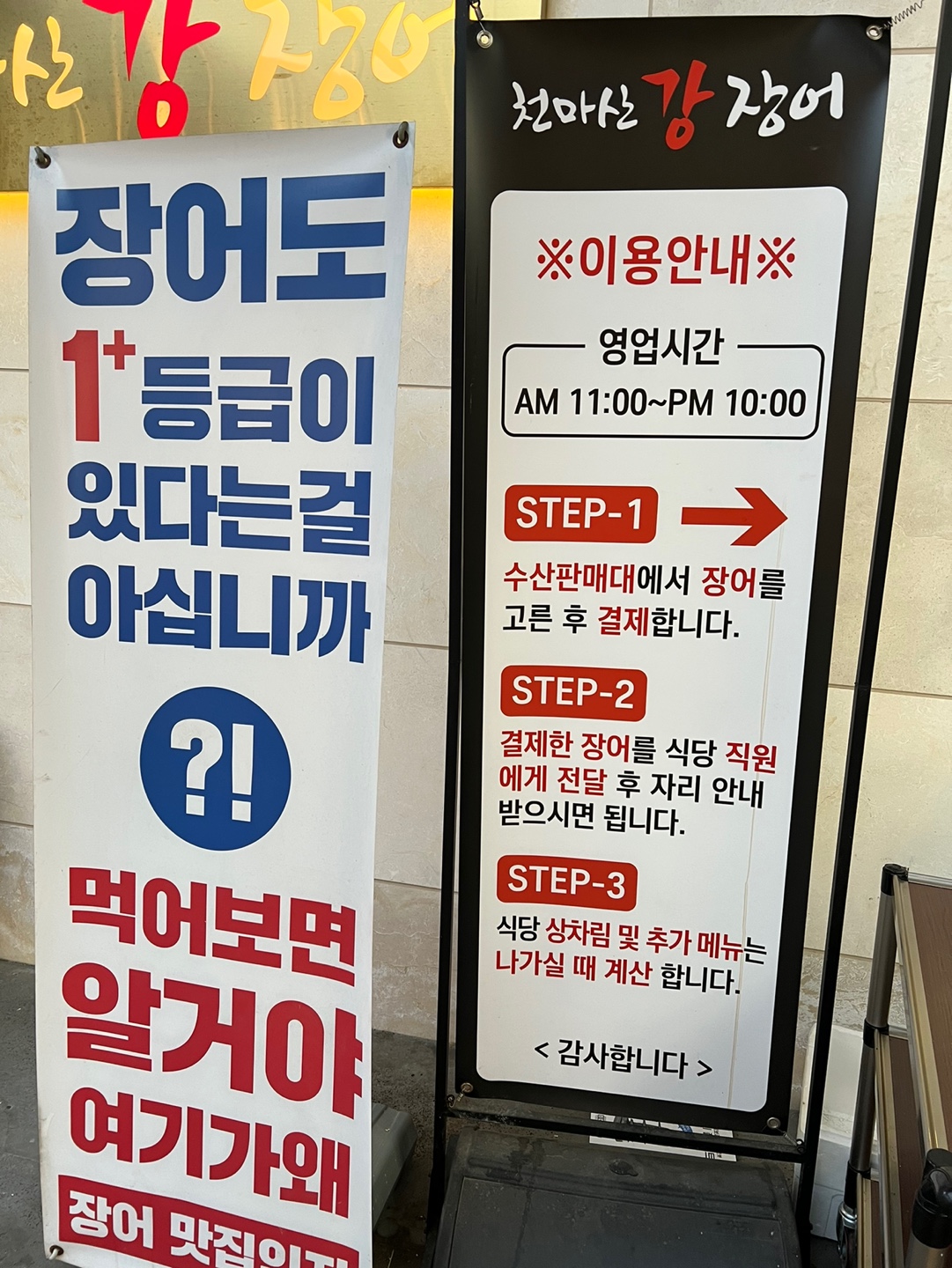 이렇게 식당 내부로 들어가기 전에 옆에 조그만하게 판매장이 있습니다. 거기서 인원수대로 세팅을 해놓았으니 인원수에 맞게 장어를 고르시면 됩니다.