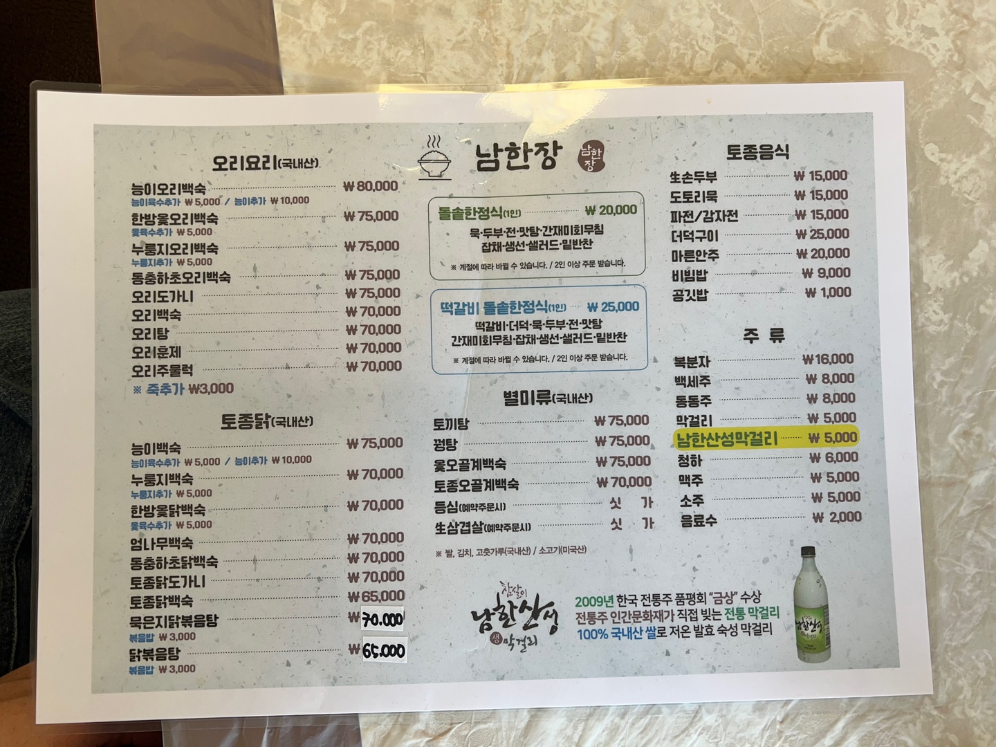 인터넷에 남한산성 맛집을 찾아도 너무 많아서 제대로 찾기 힘들고 대부분의 메뉴가 닭, 오리 메뉴라 맛은 거의 다 똑같을 거 같아 바로 눈에 띄는 '남한장'으로 향했습니다.