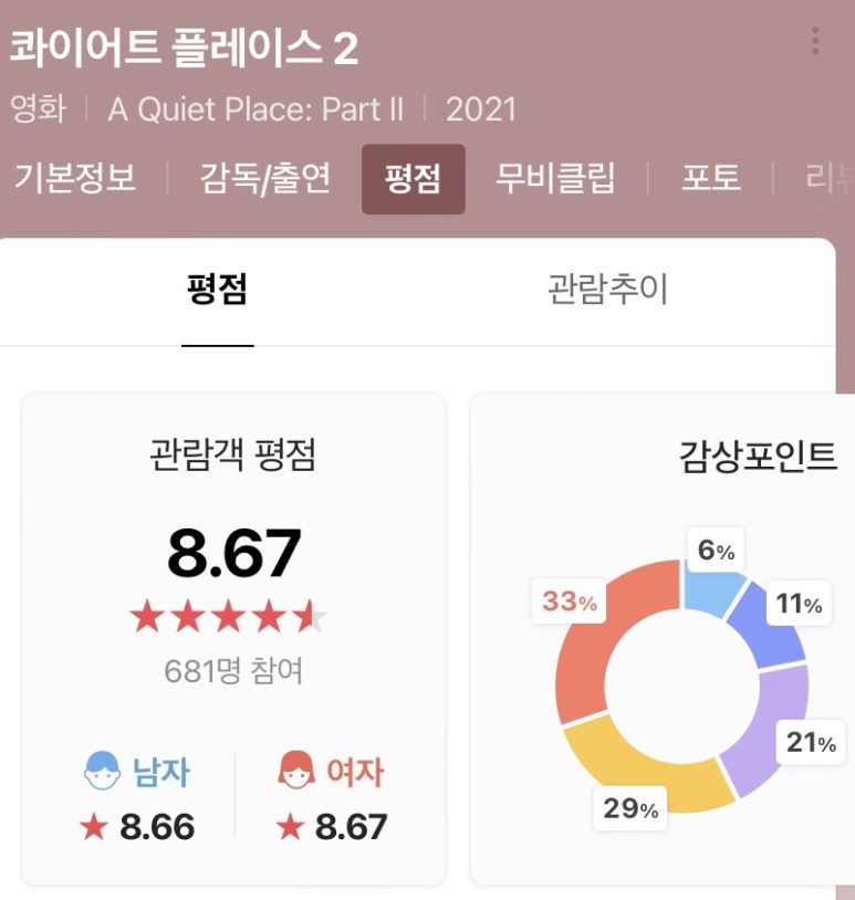 기본적인 정보와 네이버 평점입니다. 남녀 모두 재미있게 본 영화로 대체적으로 평점이 좋았습니다.