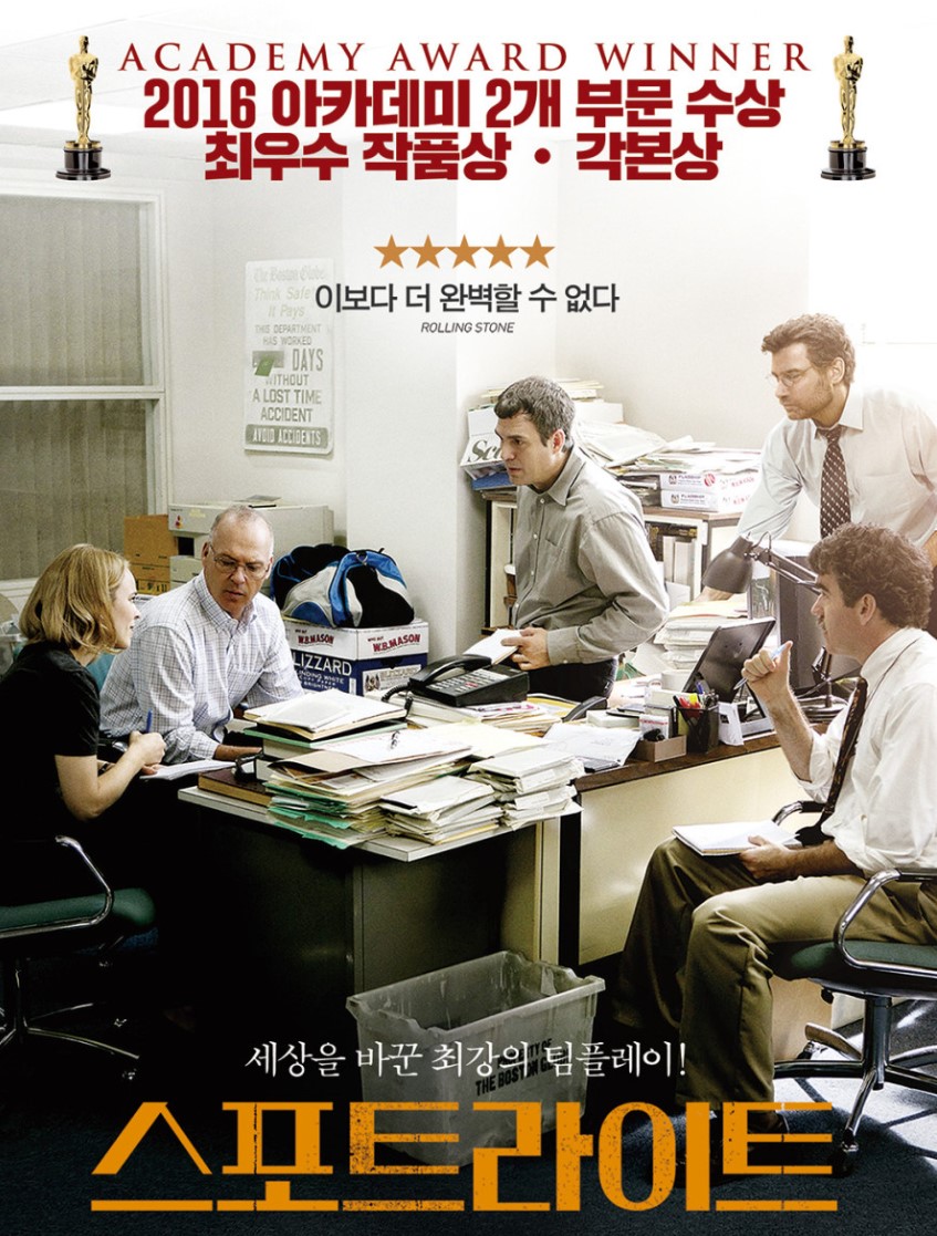 이 작품도 실화바탕의 영화로 보스턴 글로브 기자들이 가톨릭 아동 범죄에 대한 내용을 보도하기 위해 노력하는 스토리입니다. 아카데미 시상식에서 최우수 작품상, 각본상을 수상했고 출연진들도 화려한 영화로 보는 재미가 있고 몰입감이 좋은 작품입니다.