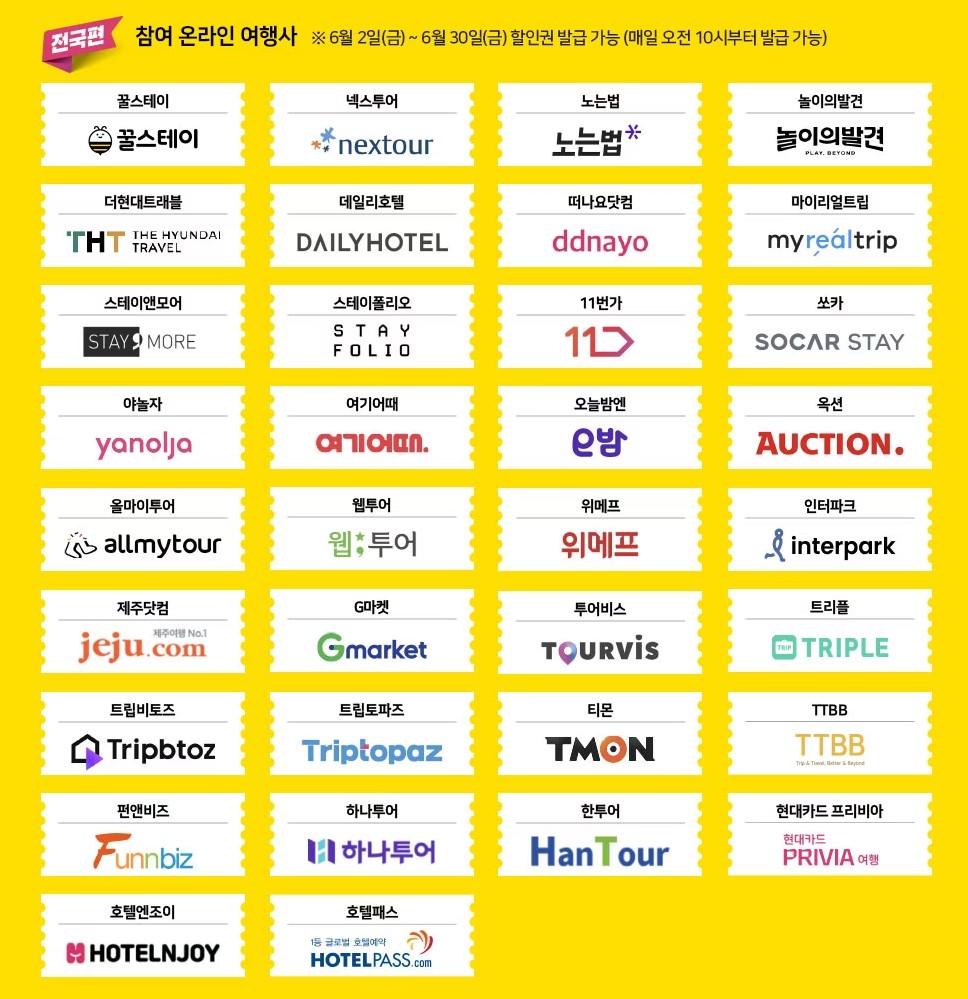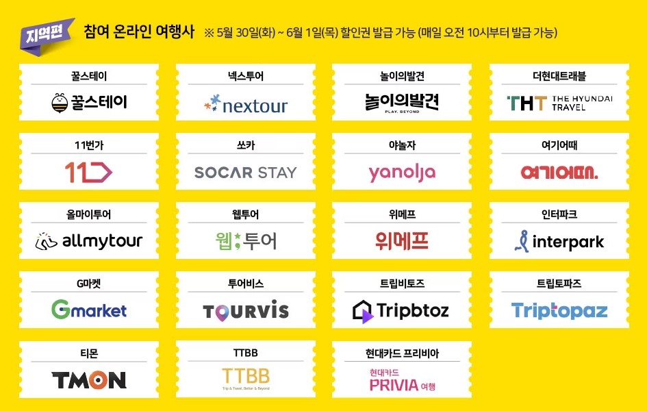 5월 30일~6월 1일까지 3일 동안 발급과 예약이 가능한 지역편은 숙박이 가능한 기간은 5월 30일~7월14일까지로 이 프로모션에 참여하는 여행사는 아래의 사진과 같습니다. 할인은 7만원 초과 숙박 시 5만원까지 할인을 받을 수 있으며 지역편 할인권을 사용하게 되면 전국편 할인권은 사용할수 없습니다.