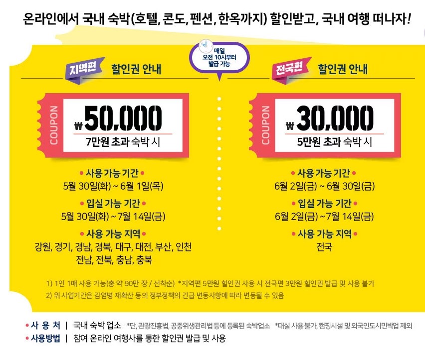 전국편은 6월 2일~6월 30일까지 발급과 예약이 가능하고 사용기간은 6월 2일~7월 14일까지 입실 가능합니다. 5만원 이상 초과 숙박시 3만 원 할인이 됩니다. 지역편과 전국편 모두 감염병의 재확산이나 정부정책의 긴급 변동이 있을 시에는 변경될 수 있으니 참고하셔야 되겠습니다.