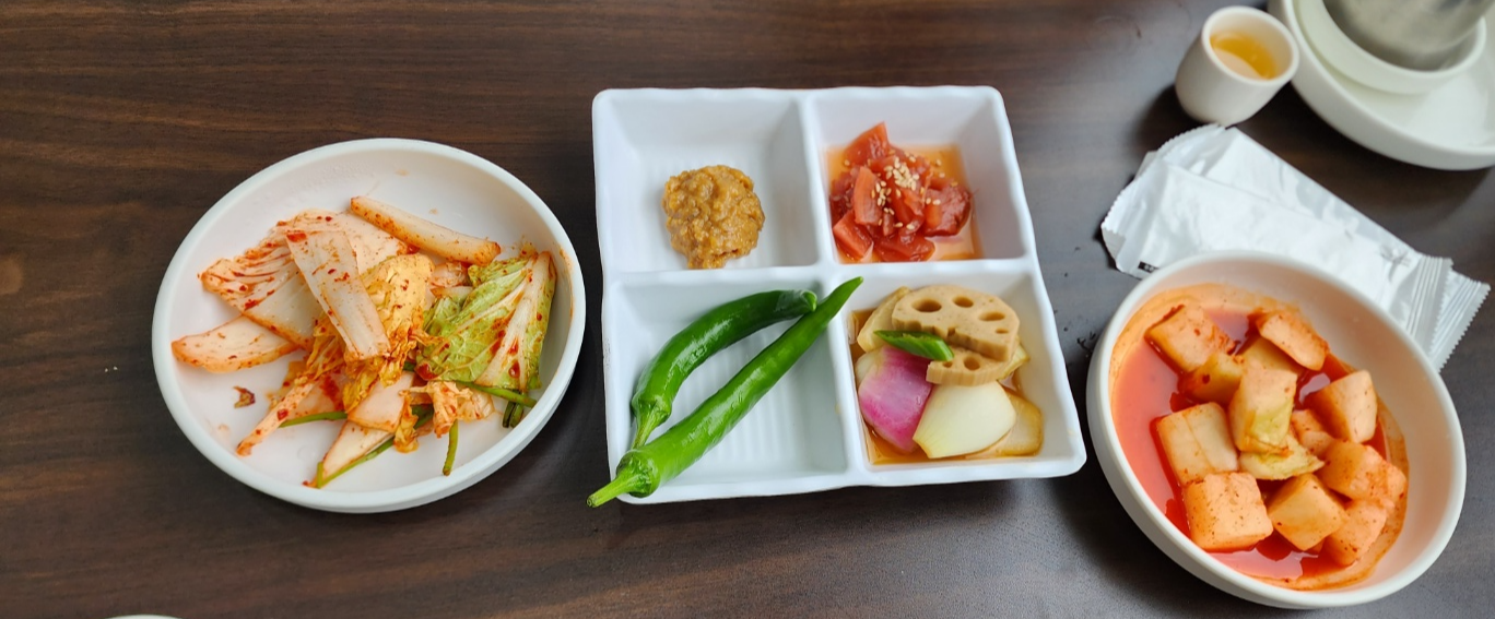 먹기 전에 감잎차와 당귀차, 양파차가 있으니 물대신 마시니 좋았습니다. 건강에 좋은 음식도 먹고 차도 먹고 메뉴를 먹기 전부터 아주 만족이었습니다. 처음 반찬이 세팅되고 셀프로 계속 가져다 먹을 수 있는데 굉장히 청결해서 좋았습니다.