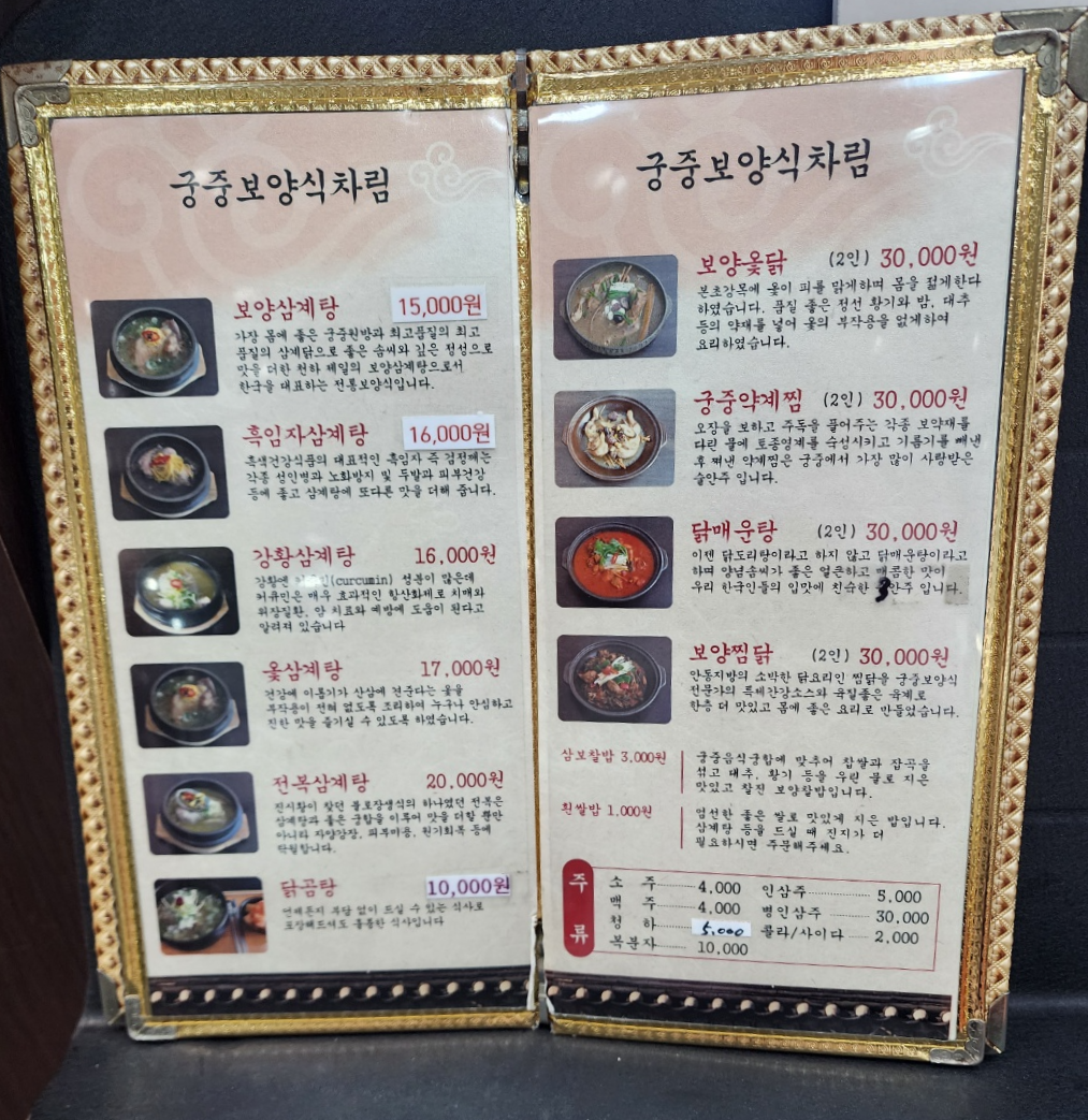 이곳은 메뉴가 정말 많습니다. 가격도 매장이나 분위기에 비해 괜찮은 것 같고 여러 명이 가서 먹기 딱 좋은 메뉴들이 많이 있습니다. 저는 기본부터 먹어보기로 하고 보양삼계탕을 주문했습니다. 다음에 방문할 때는 보양찜닭을 한번 먹어봐야겠습니다.