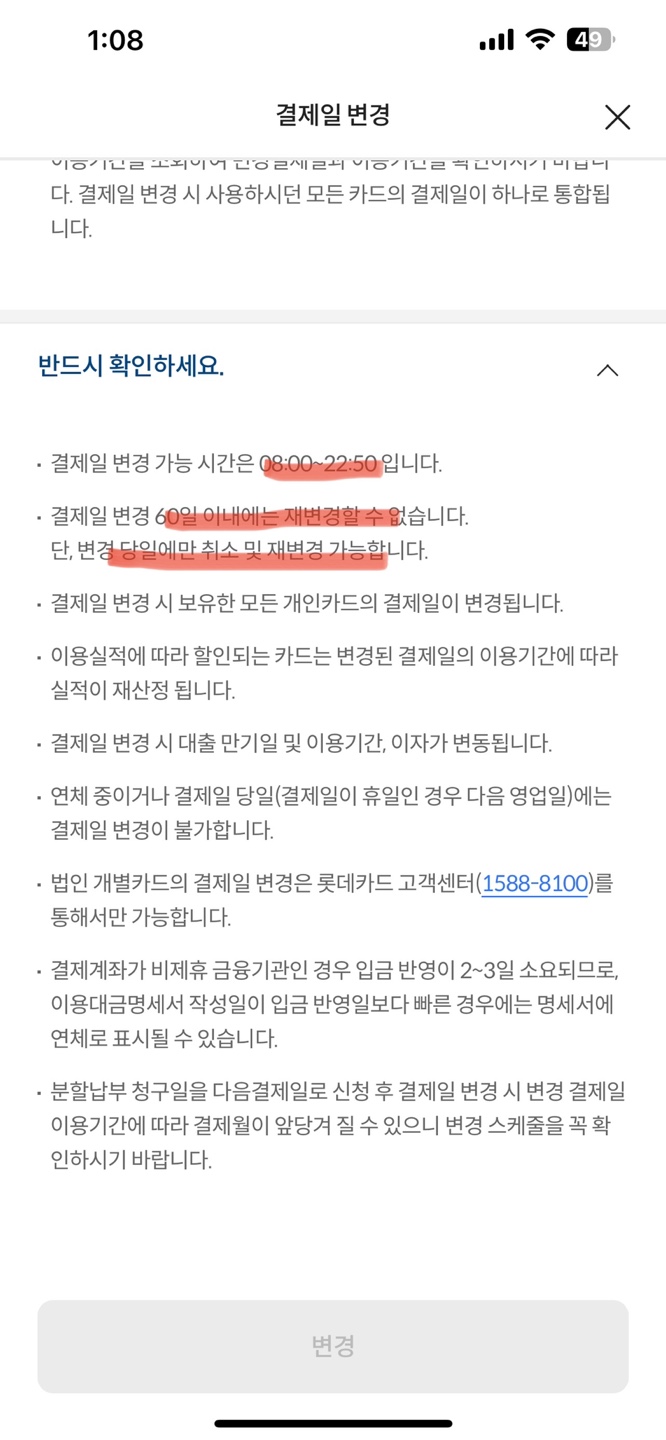 변경하는 건 생각보다 훨씬 쉽지만 반드시 확인해야할 부분들은 꼭 확인해 보시고 변경하시는 게 좋을 것 같습니다. 결제일 변경 시 보유한 모든 개인카드의 결제일이 변경이 된다고 하는데 롯데카드가 여러장 쓰는 분들은 결제일이 서로 다를 수없고 같은 날 결제가 된다는 말이니 꼭 확인해 보시고 변경하시길 바랍니다.