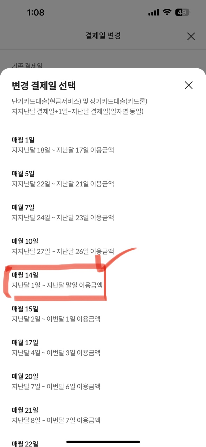 많은 분들이 카드 사용금액을 알기 쉽도록 매월 14일에 결제를 하도록 바꾸시는데 제가 봐도 지난달에 사용금액이 청구되도록 하는 게 헷갈리지 않고 좋을 것 같았습니다. 그래야 지출내역도 기억하기 쉽고 소비습관도 바뀔 수 있을 것 같습니다.