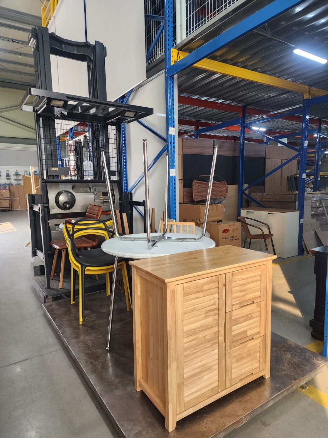 아리아퍼니처는 인터넷으로 구경해도 웬만한 곳보다는 저렴하게 판매하고 있었습니다. 그래도 이곳에 오면 좀 더 할인을 받을 수 있으니 가까운 곳에 사시면 한번 와봐도 좋을 것 같습니다. 구입한 상품들은 저런 식으로 지게차를 이용하여 2층에서 꺼내 1층으로 내려와 실을 수 있습니다.