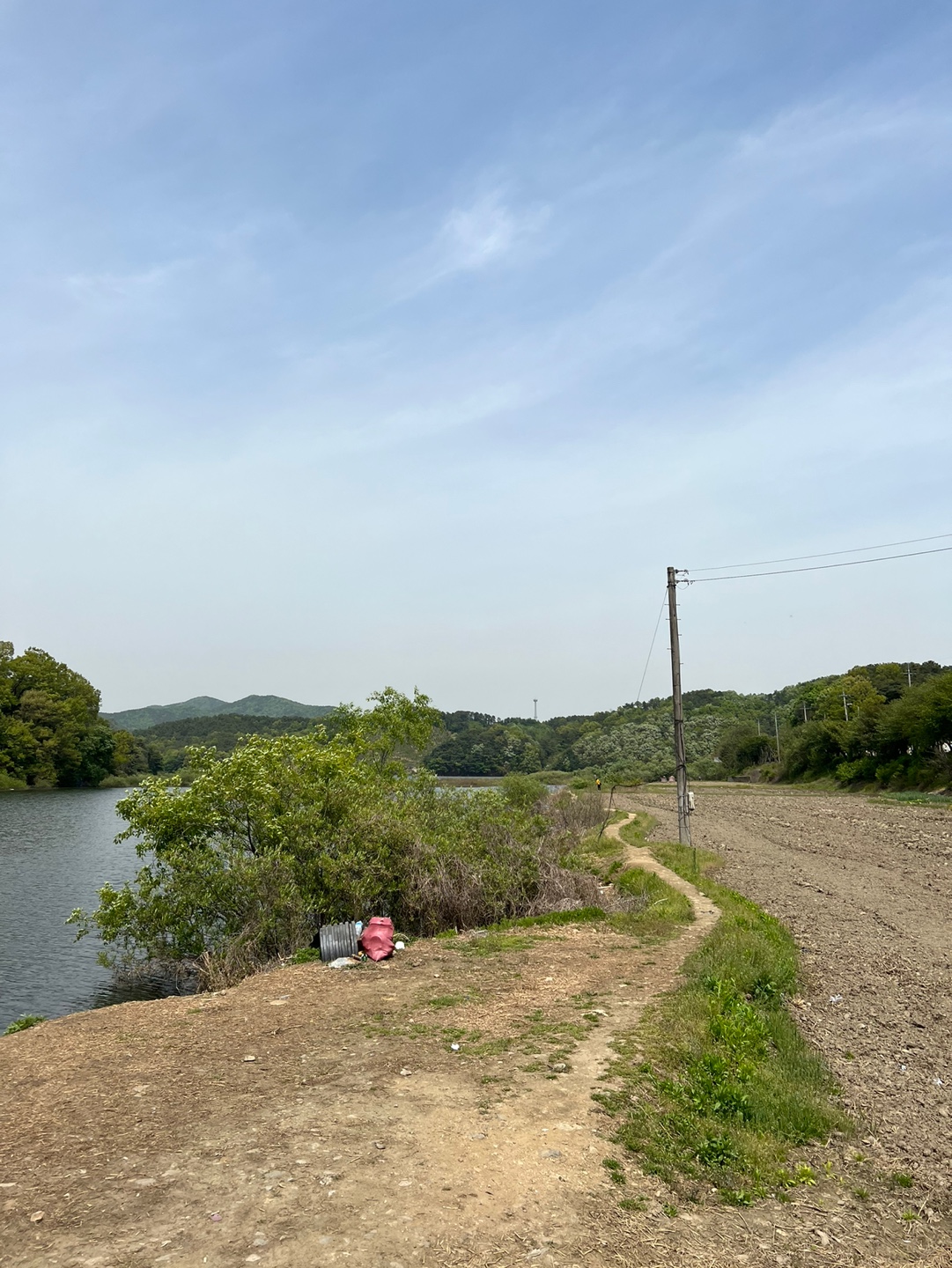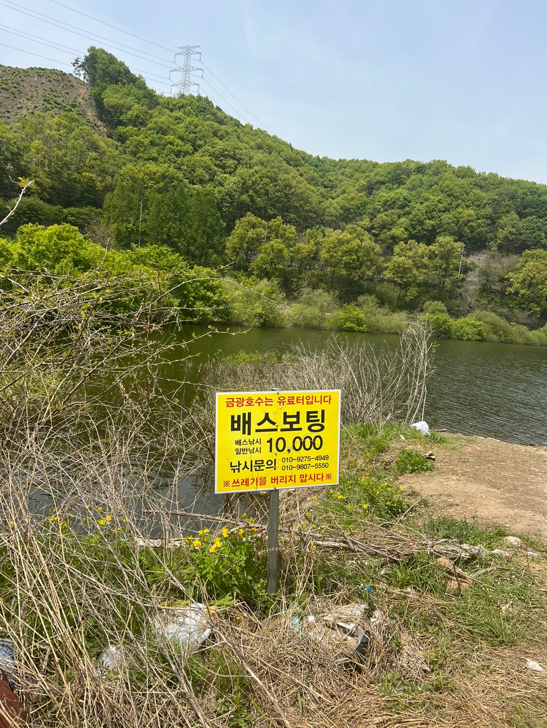 요즘 모든 곳이 물이 만수라 깊고 발판이 좋지 않은 것 같습니다. 작년 여름에 왔을 때는 물이 빠져있어서 장화 신고 안쪽까지 걸어갈 수 있었는데 이번에 갔을 때는 물이 너무 많아서 자리가 한정되어 있었습니다. 우선 주차를 하고 내려보니 이미 배스 낚시 하는 사람들이 몇 명 보였습니다. 배스뿐 아니라 붕어낚시하는 사람도 많았는데 저는 개인적으로 붕어낚시를 하고 싶지만 장비와 준비하는 게 너무 귀찮아 보여 그냥 배스낚시만 하고 있습니다.