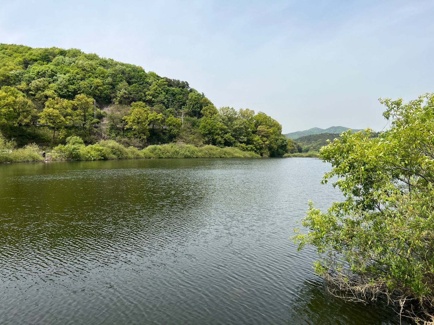 역시 길이 좋아도 낚시할 때 장화는 필수로 가져가야 할 것 같습니다. 날씨는 화창해서 풍경이 너무 좋았고 좀만 들어가니 우거진 나무 사이로 붕어낚시하는 사람들이 자리를 펼쳐 더 이상은 갈 수 없었습니다. 자리들을 정말 명당으로 잘 찾아들어가는 것 같습니다.