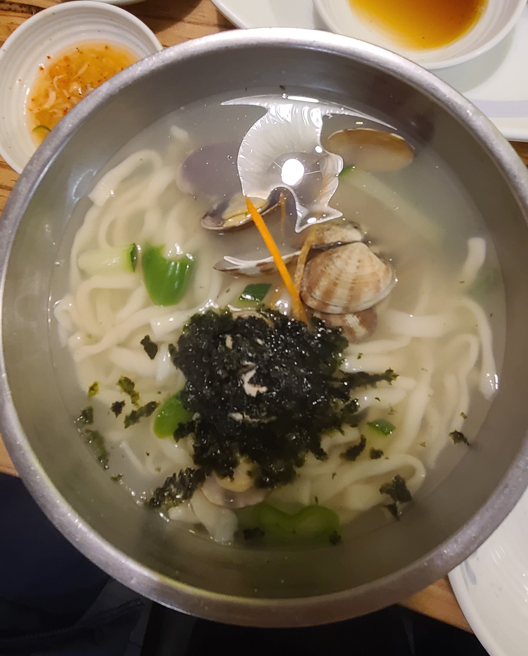 육수는 바지락으로 우려내어 깔끔하고 시원하며 고추간장을 풀어 먹으면 얼큰하게 먹을 수 있어 좋아하시는 분들은 조절해서 드시면 되겠습니다.