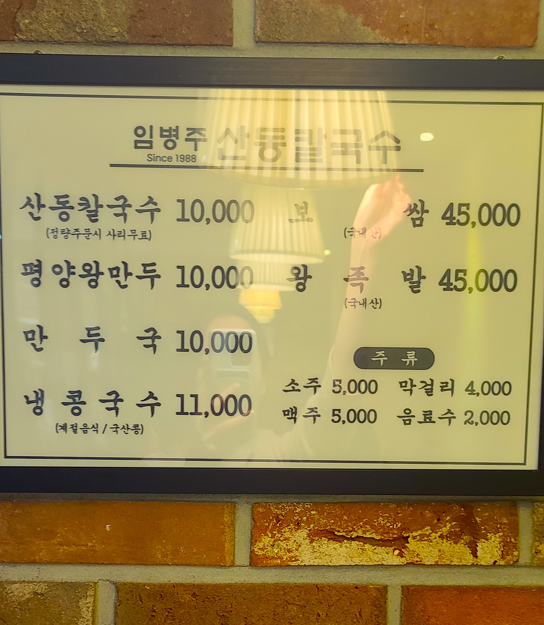 메뉴가 조명 때문에 수정을 해봐도 잘 보이지는 않는데 대표 메뉴 칼국수는 10,000원으로 다른 곳이랑 가격은 비슷합니다. 그리고 저희는 성인 네 명이서 칼국수 하나씩 시키고 왕만두와 보쌈을 시켰습니다.