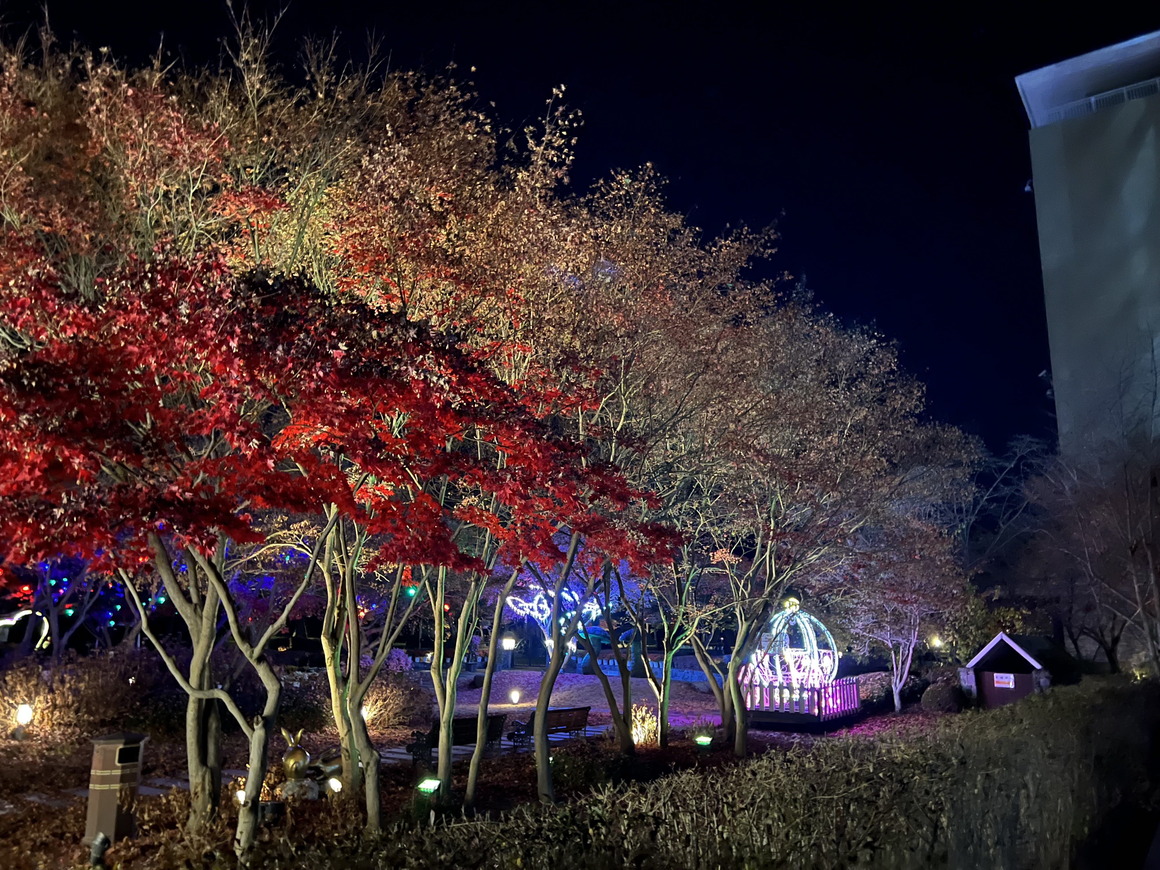 저녁을 다 먹고 리조트로 복귀하니 뒤쪽 정원에 조명들이 너무 잘 꾸며져 있어 사진찍기 참 좋았습니다. 초겨울이지만 낙엽들이 다 떨어지지 않았고 단풍색도 너무 화려해서 조명에 비치니 너무 이뻤습니다. 가족들이 나와서 사진 찍는 모습이 참 보기 좋았습니다.