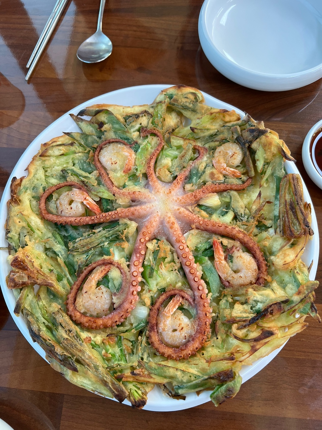 낙지 한 마리 파전이 먼저 나왔고 정말 한 마리가 아주 크게 파전에 파고들었는데 맛이 기가 막혔습니다. 겉은 제대로 바삭하고 속은 촉촉해서 주문하길 잘했다는 생각이 바로 들었습니다. 해물은 새우와 낙지 한 마리 있고 낙지가 생각보다 커서 좋았습니다.