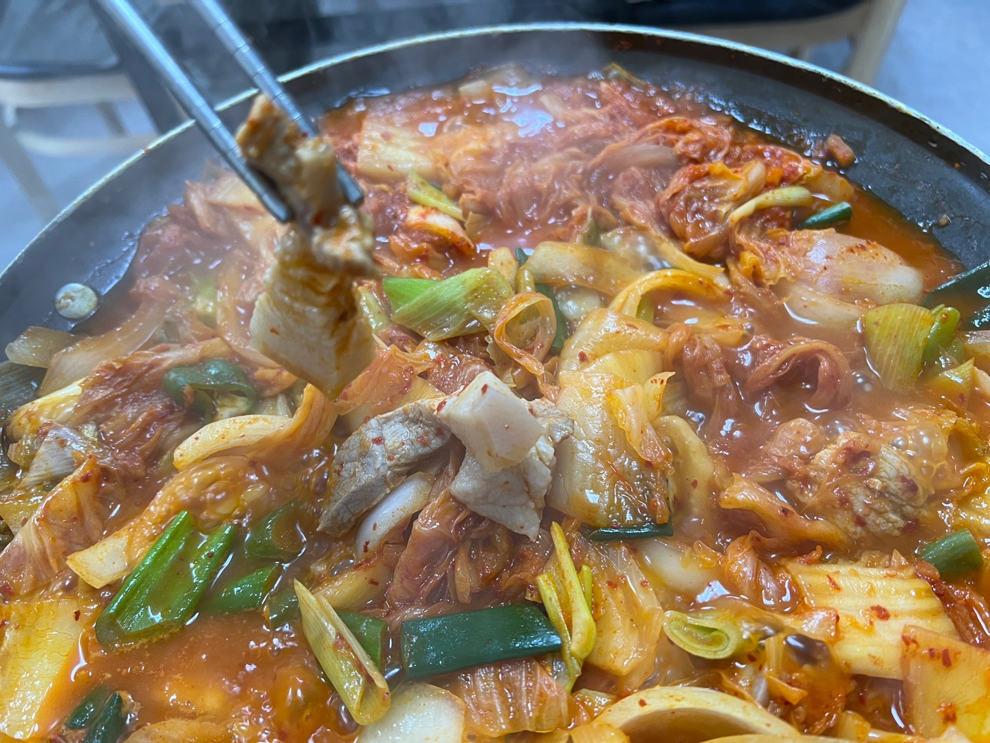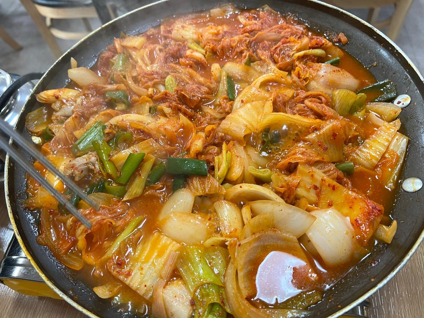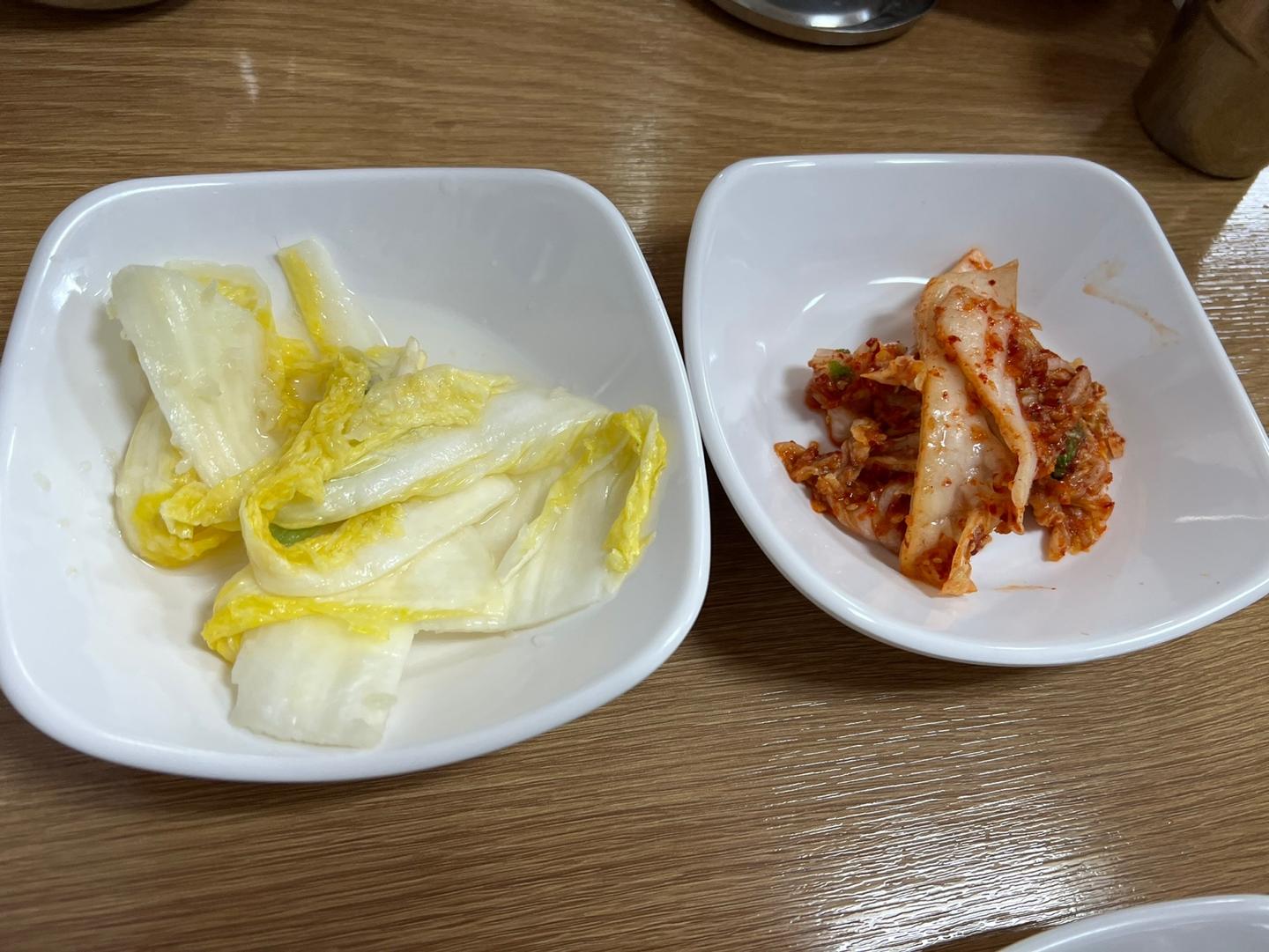 메뉴가 김치가 메인인데 밑반찬도 김치 두 종류가 나와서 사실 당황은 좀 했습니다. 풀이라도 좀 주면 좋았을 텐데 했지만 먹어보니 다른 밑반찬은 필요 없었고 김치두루치기에 밥만 있으면 딱 좋았으며 백김치가 너무 맛있어서 몇 번을 리필했는지 모르겠습니다.