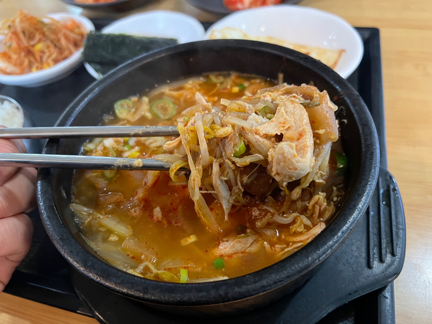 그리고 닭계장은 몇 숟갈 먹어보니 굉장히 칼칼하고 얼큰해서 술 먹고 다음날 해장하기 딱 좋은 맛입니다. 하지만 돌솥 메뉴들은 너무 뜨거워서 선호하질 않습니다. 그래도 반찬이 김이랑 계란 프라이까지 나오니 이 메뉴도 인기메뉴는 맞을 것 같습니다.