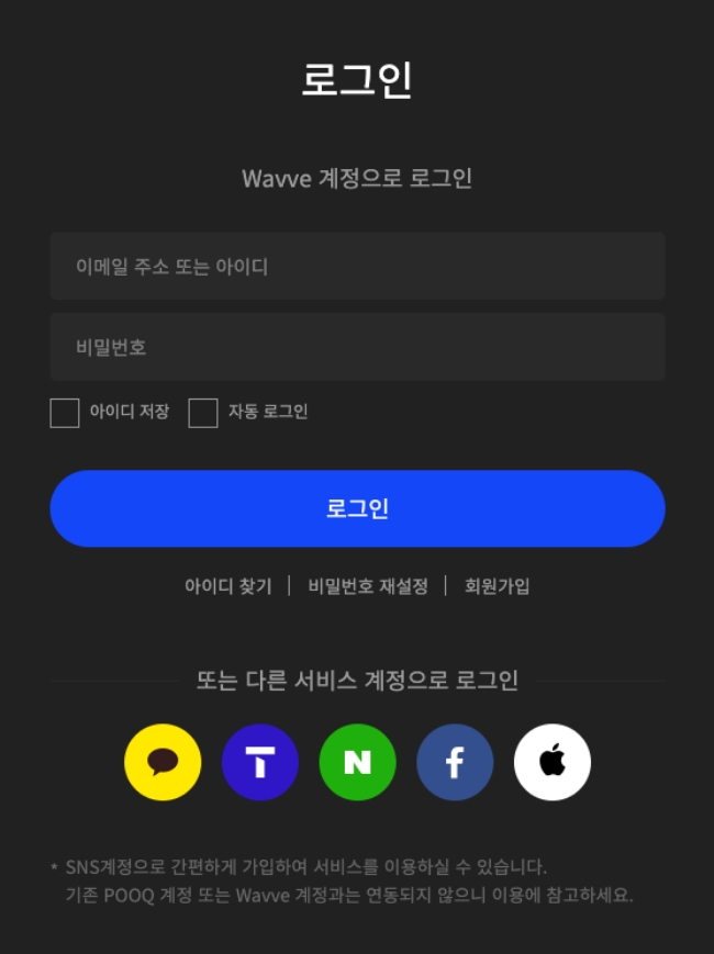 웨이브는 별도의 회원가입을 안 해도 카카오톡, T 아이디, 네이버, 페이스북, 애플 계정으로 바로 이용을 할 수 있어 원하시는 계정을 고르시면 됩니다. 계정을 들어가셔서 간단한 인증과 동의만 하시면 바로 회원가입이 가능합니다.