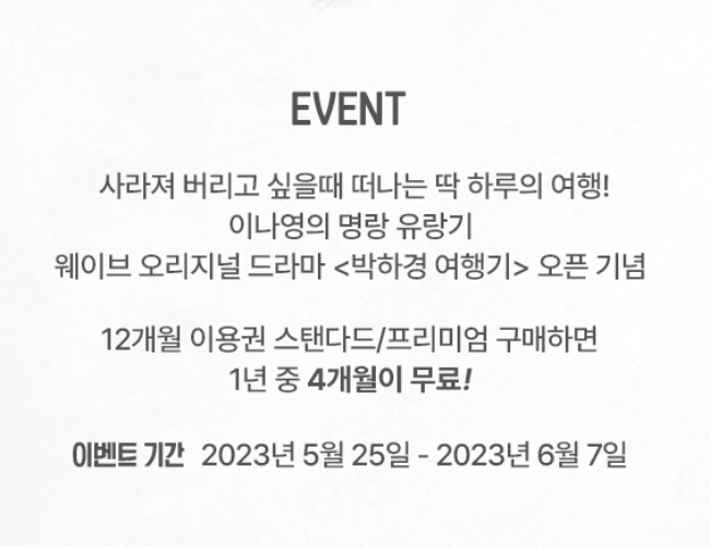 현재 2023년 5월 25일~2023년 6월 7일까지 이벤트를 하고 있는데 기간 중에 스탠다드나 프리미엄 이용권을 구매 시 1년 중 4개월을 무료로 볼 수 있는 혜택을 받을 수 있습니다. 웨이브 오리지널 드라마 <박하경 여행기> 오픈 기념으로 이벤트 중인데 현재 가입을 원하시는 분들은 더욱 저렴하게 이용권을 구입할 절호의 기회입니다.