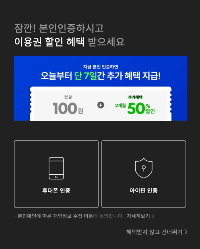회원가입을 마치셨다면 본인 인증을 한 후 100원에 이용할 수 있는 혜택을 받을 수 있는데 PC로 로그인을 해야 첫 달 이용권 배너가 보이기 때문에 PC로그인을 추천합니다.