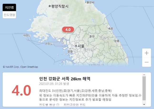 2023년 1월 9일 01:28 쯤 인천 강화군 서쪽 인근바다에서 규모 4.0 지진이 발생했습니다. 저도 좀 전에 창문이 약간 흔들리는 느낌을 받아 놀랐습니다. 작년 충북 괴산에 이어 두 번째로 지진을 느껴보는데 요즘 들어 지진이 왜 이렇게 나는지 모르겠습니다.