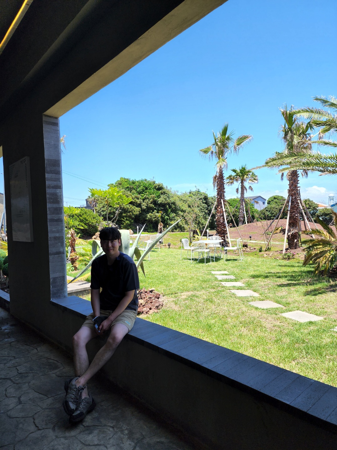 정원 쪽에는 야자수가 많아 마치 동남아 여행 온 느낌을 줄 수 있었습니다. 구름 한 점 없는 파란 하늘이 정말 이쁘네요.