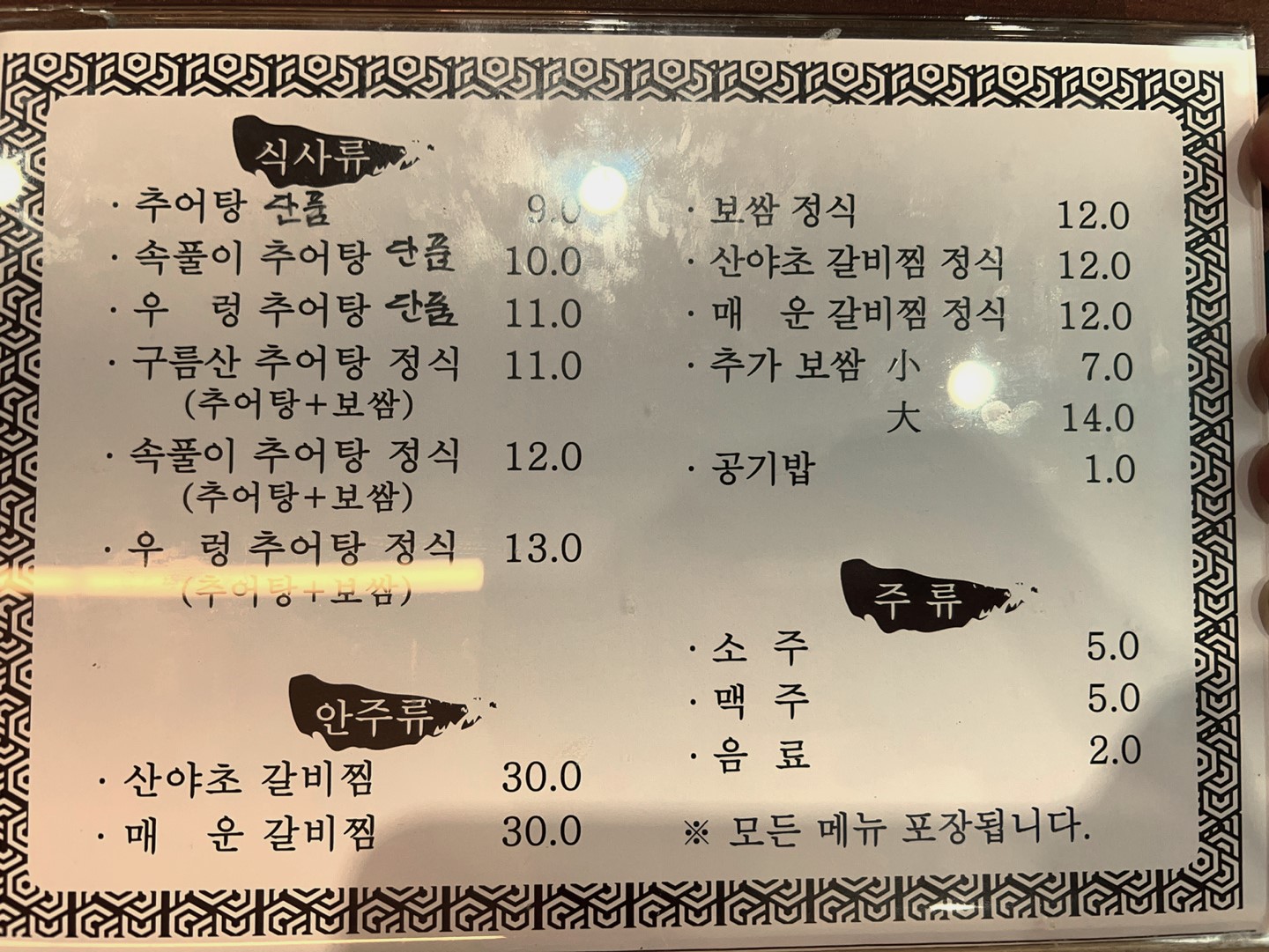여기 메뉴는 추어탕 단품메뉴가 3개 정식메뉴가 3개로 보쌈 정식과 산야초 갈비찜 정식도 아주 맛있게 나옵니다. 저희는 오늘 3명이서 속풀이 추어탕, 갈비찜 정식, 보쌈 정식 이렇게 주문을 했습니다. 산초가루와 다진 마늘, 고추, 들깨가루가 있는데 취향대로 넣어 드시면 됩니다. 저는 개인적으로 다진 마늘을 많이 넣어 먹는데 마늘맛이 참 잘 베고 좋습니다.