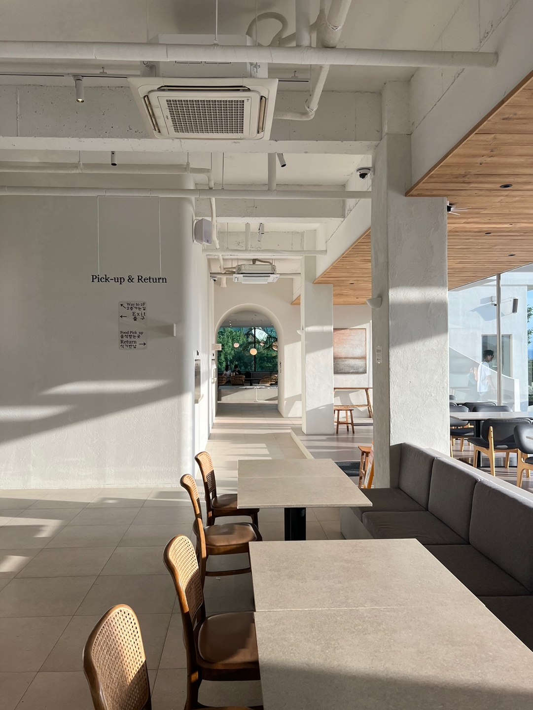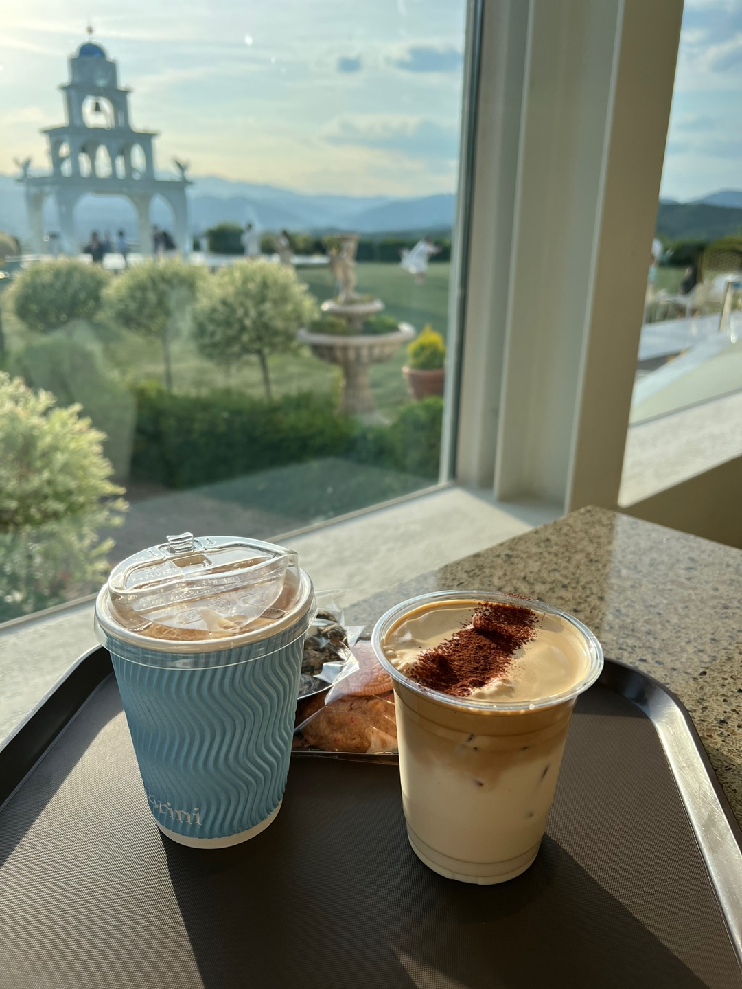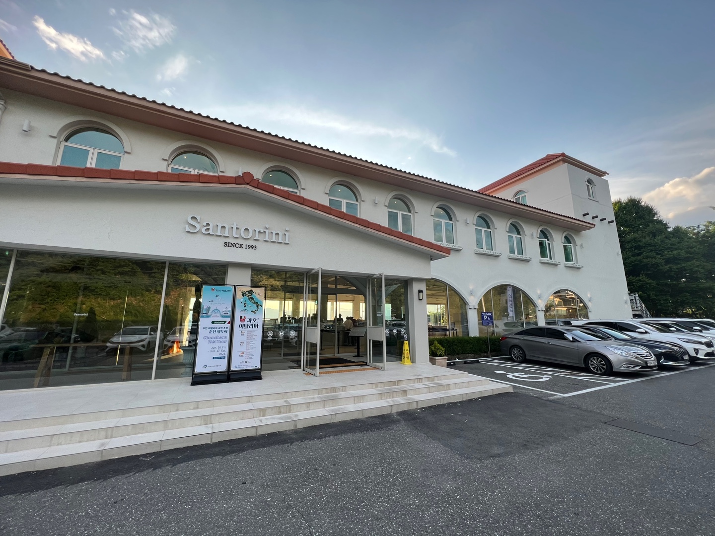 주차장은 엄청 넓지만 자리가 없으면 길가에 세워두셔도 됩니다. 저는 오늘 길가에 주차하고 들어갔습니다. 역시나 유명한 곳답게 사람들이 엄청 많았고 야외에는 산토리니 종탑이 아주 멋지게 뷰를 등지고 있었습니다. 카페 내부도 인테리어가 너무 이쁘고 야외에도 정말 잘해놔서 사람들이 사진 찍기 바빴습니다.