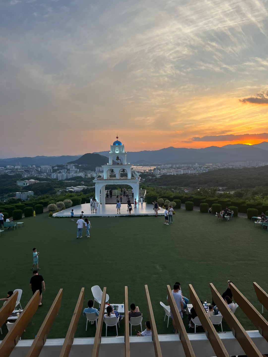 저희는 노을을 보기 위해 6시쯤 야외로 나가서 봤는데 날씨도 시원하고 딱 좋았습니다. 주위에 구봉산 능선으로 둘러싸여 있고 시원한 전망에 노을을 보니 눈이 정화가 되면서 스트레스가 다 풀렸습니다.