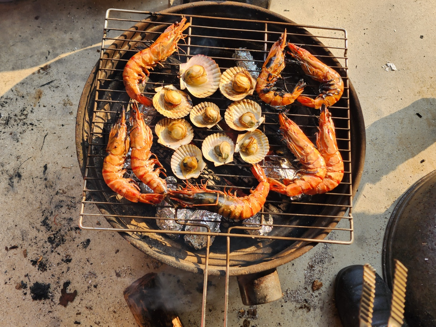 오전에 불을 지폈다면 오후에는 먹느라 시간이 다 갔습니다. 석화를 왠만큼 먹고 가리비와 새우도 구웠습니다. 사실 가리비의 크기는 살짝 작았지만 양이 많아서 괜찮았습니다. 새우도 크기가 엄청 커서 배부르게 먹을 수 있었습니다.