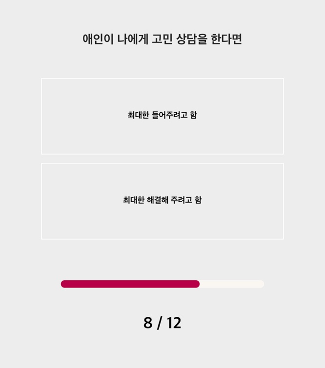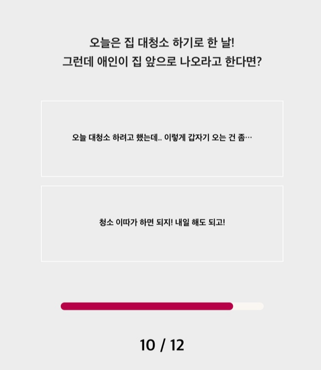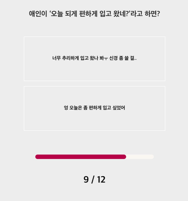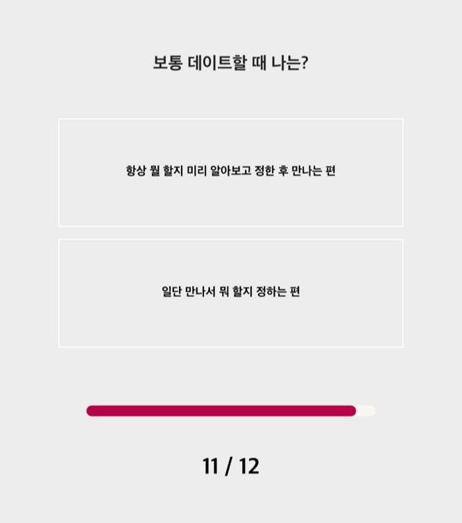 아무튼 연애테스트는 총 12개의 문제가 나오는데 의식의 흐름대로 그냥 생각나는 대로 바로바로 답을 찍고 넘어가시면 됩니다. 너무 생각하고 찍으면 내 성격이랑 안 맞게 되는 것 같습니다.