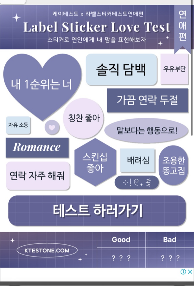 케이테스트 라벨스티커 테스트가 요즘 한창 유행입니다. 성격편에 이어 연애편도 나와서 한번 해보게 되었는데 생각보다 문제가 많이 없고 생각 없이 두 선택지 중 하나만 고르면 되는 거라 1분도 안돼서 끝낼 수 있습니다. 무조건 맞는다고 생각하진 않지만 재미로 하기에는 좋은 것 같습니다.