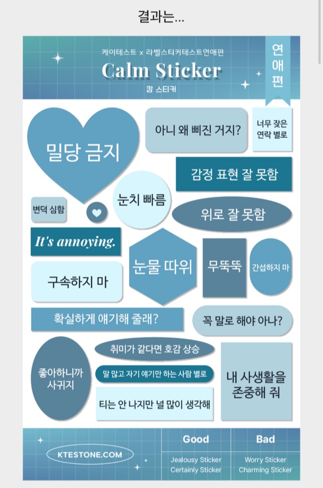 그래서 저는 결과가 캄 스티커로 나왔는데 개인적으로는 감정 표현 잘 못함 이거 말고는 잘 모르겠습니다. 어차피 성격테스트는 잘 믿지 않는 편이지만 재미로는 해볼 만한 것 같습니다. 이걸로 서로 결과를 확인하고 좀 더 잘 알게 되고 이해되면 좋을 것 같은데 잘못된 정보를 주면 안 되니 너무 맹신만 하지 않으면 될 것 같습니다.