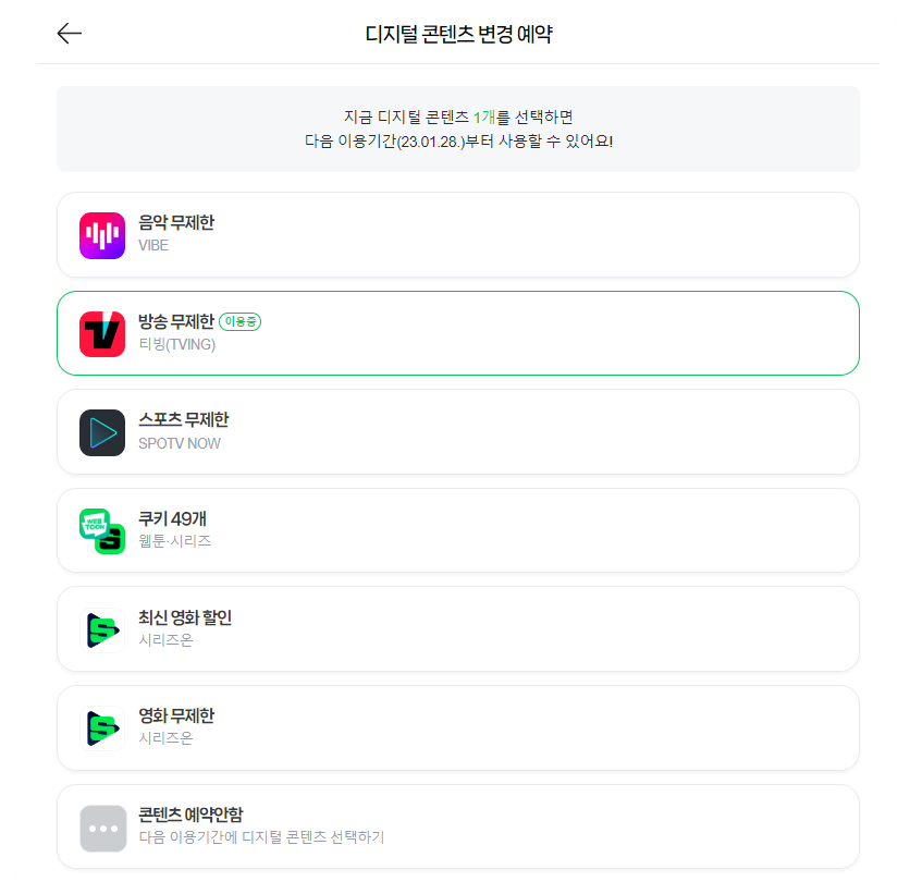 티빙 외에도 웹툰, 최신영화, 바이브 등 콘텐츠를 도중에 바꿔도 됩니다.