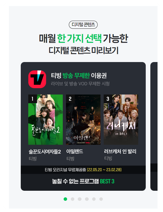 그리고 우리가 원하는 티빙 한 달 무료 이용권도 지원이 됩니다.