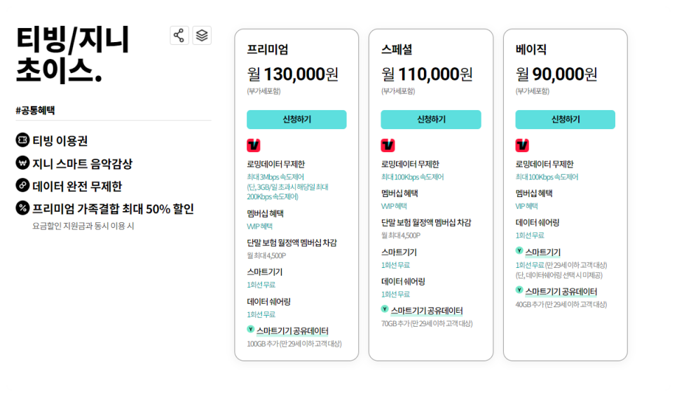 요금제에 따라 데이터 로밍 속도, 티빙의 등급이 달라지니 잘 알아보시고 가입하시는 게 좋을 것 같습니다.