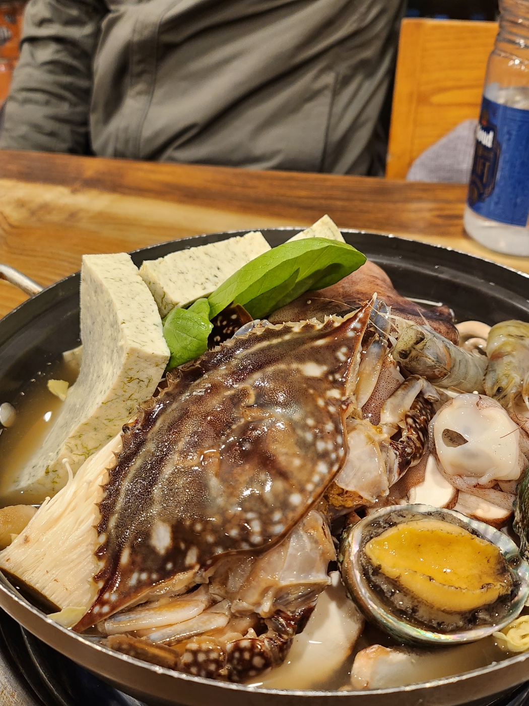 저희는 소자로 시켰는데 2명이서 먹기 충분히 많았습니다. 꽃 게 한 마리, 전복 2개, 새우 2개, 오징어 한 말이, 모두부 큼직만 하게 3개와 각종 버섯과 채소들이 들어있었는데 양이 꽤나 많았습니다.