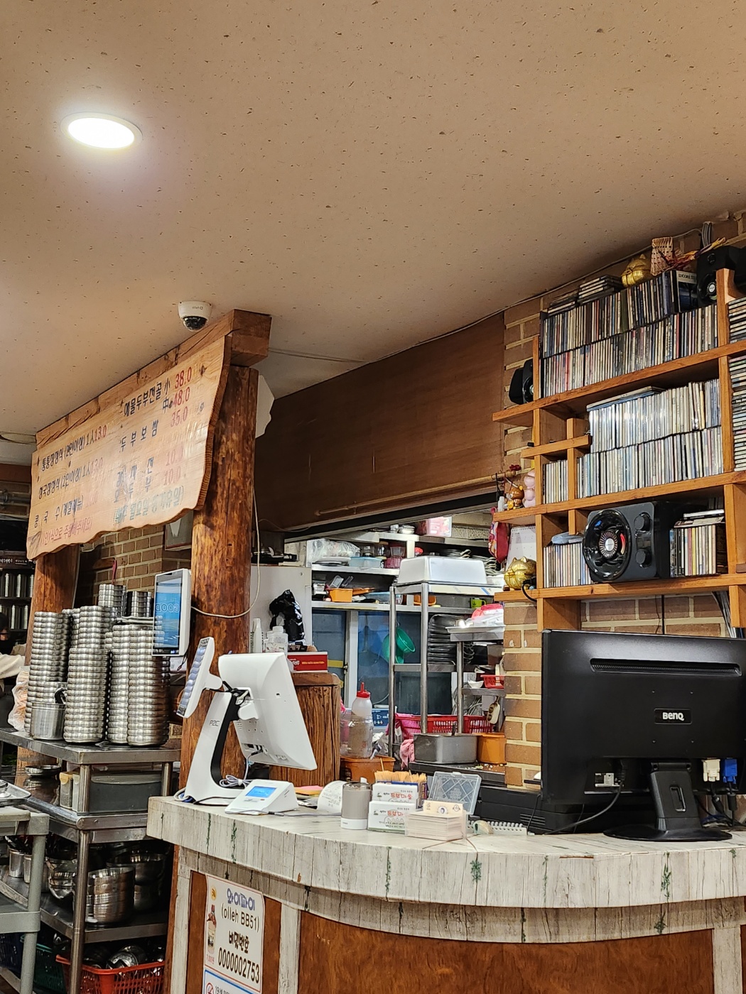 사람들이 홀에 가득 차 있어서 식사하시는 분들께 죄송해서 매장 내부사진은 찍을 수 없었습니다. 카운터를 대신하여 찍었는데 굉장히 세월이 느껴지는 분위기입니다.