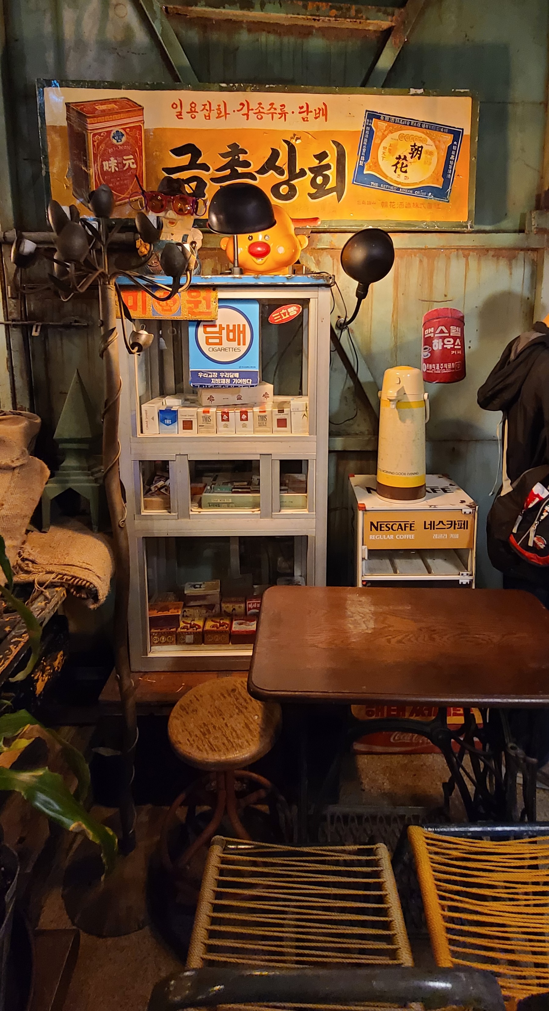 이 카페는 1층과 2층으로 되어 있고 1층은 예전에 대표적인 산업들의 인테리어가 되어 있었고 2층은 카운터와 예전 국민학교의 교실 같은 공간이 있습니다.