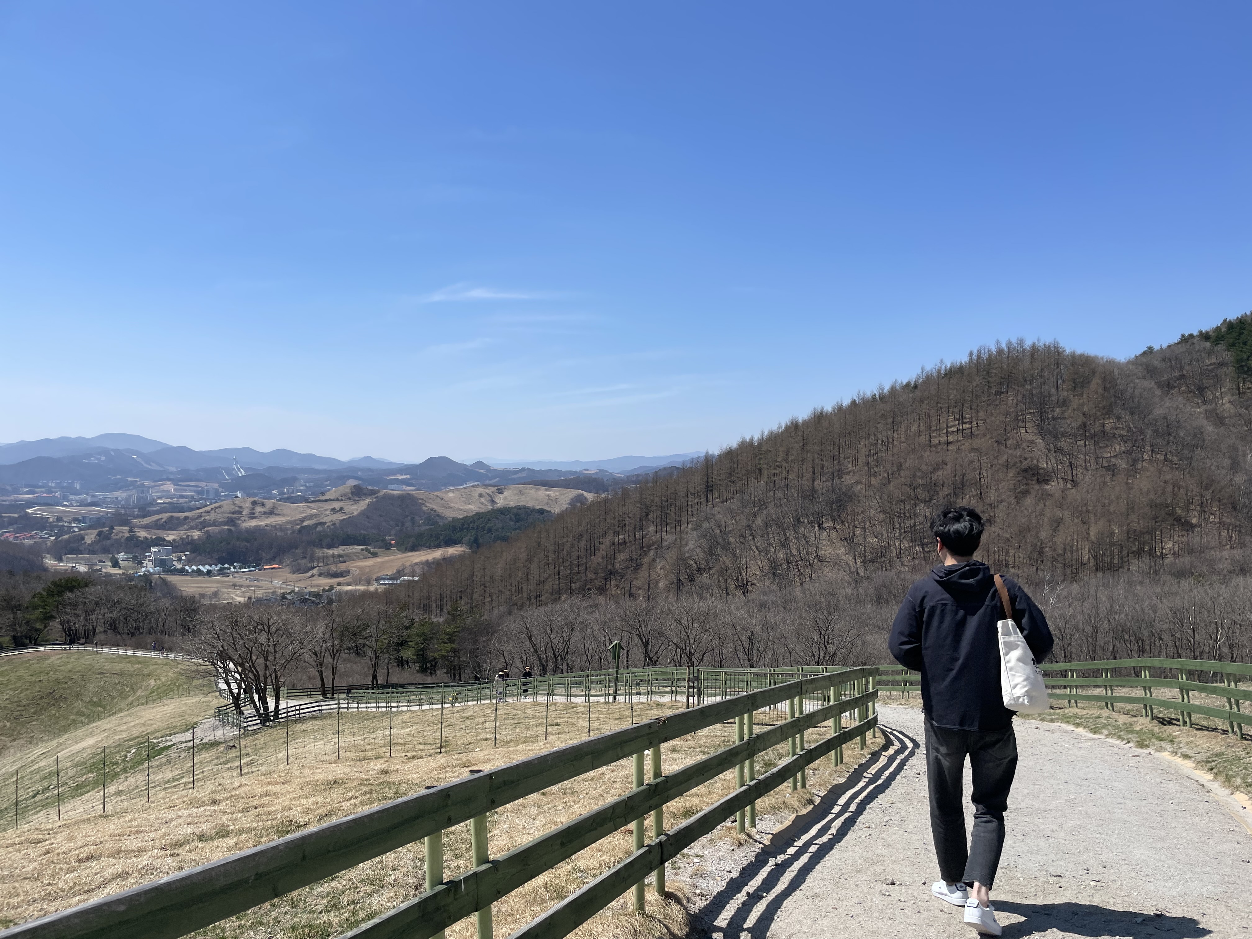 여자 친구가 뒷모습을 참 많이 찍어줬네요, 대관령에 다른 목장도 가봤지만 너무 넓어서 차로 이동도 하고 시간도 많이 걸리고 젖소나 양 등 동물들도 더 있지만 개인적으로는 아이들과 산책하기는 대관령양떼목장이 더 좋은 것 같습니다.