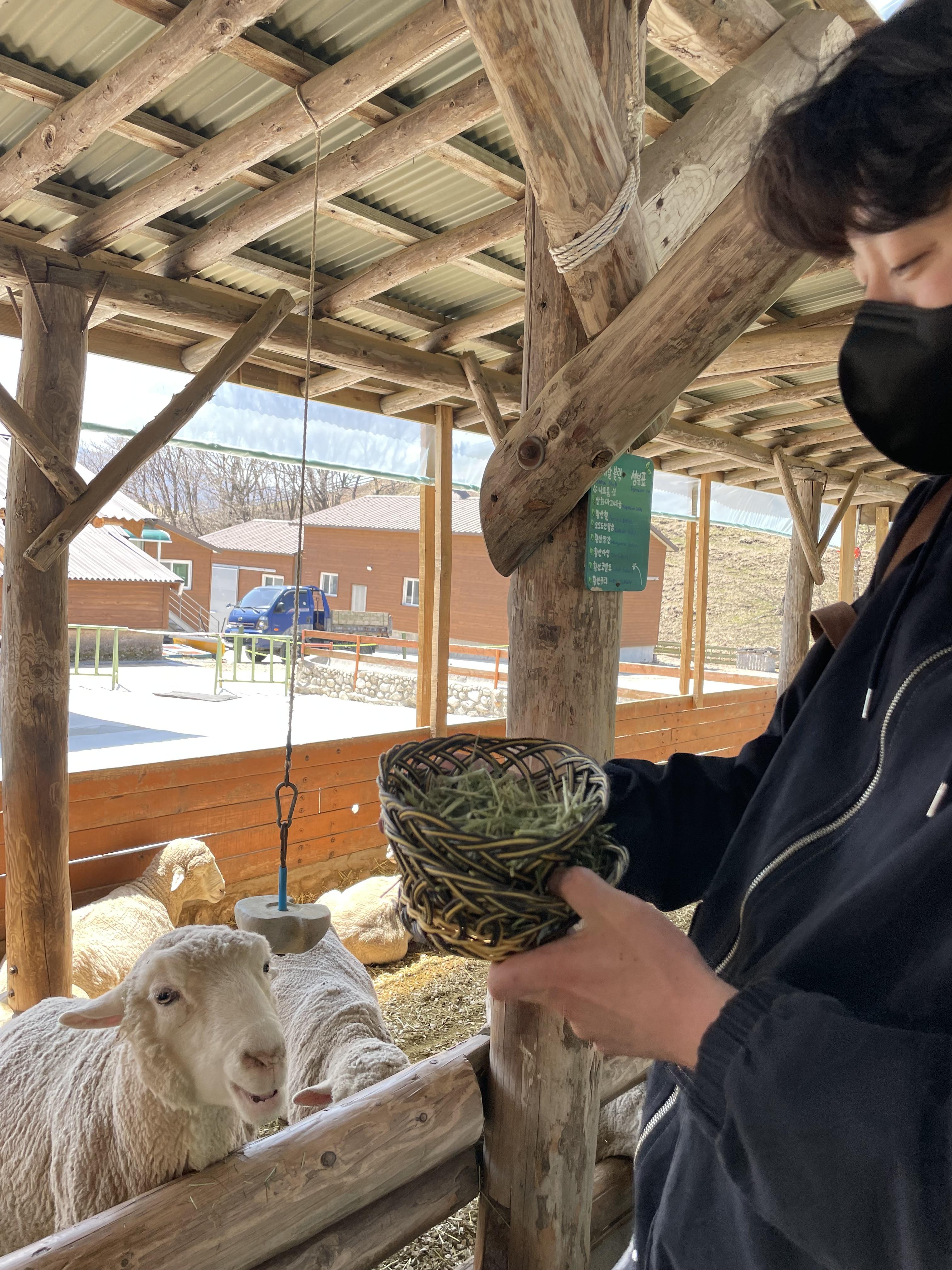 양들은 날씨 때문에 방목되지 않았고 양들이 지내는 목장 같은 건물 2개가 있더라고요, 거기서 건초를 받아 양들에게 먹이로 직접 주는 경험도 했습니다.