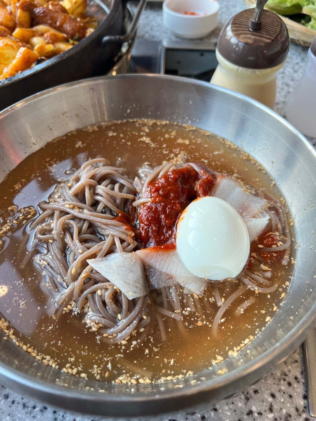 그리고 막국수를 시켜서 먹었는데 그렇게 자극적이지 않고 필요한 재료들만 딱 있어서 닭갈비와 아주 잘 어울리는 것 같았습니다. 하지만 다음에 가면 막국수 대신에 볶음밥으로 먹을 예정입니다!