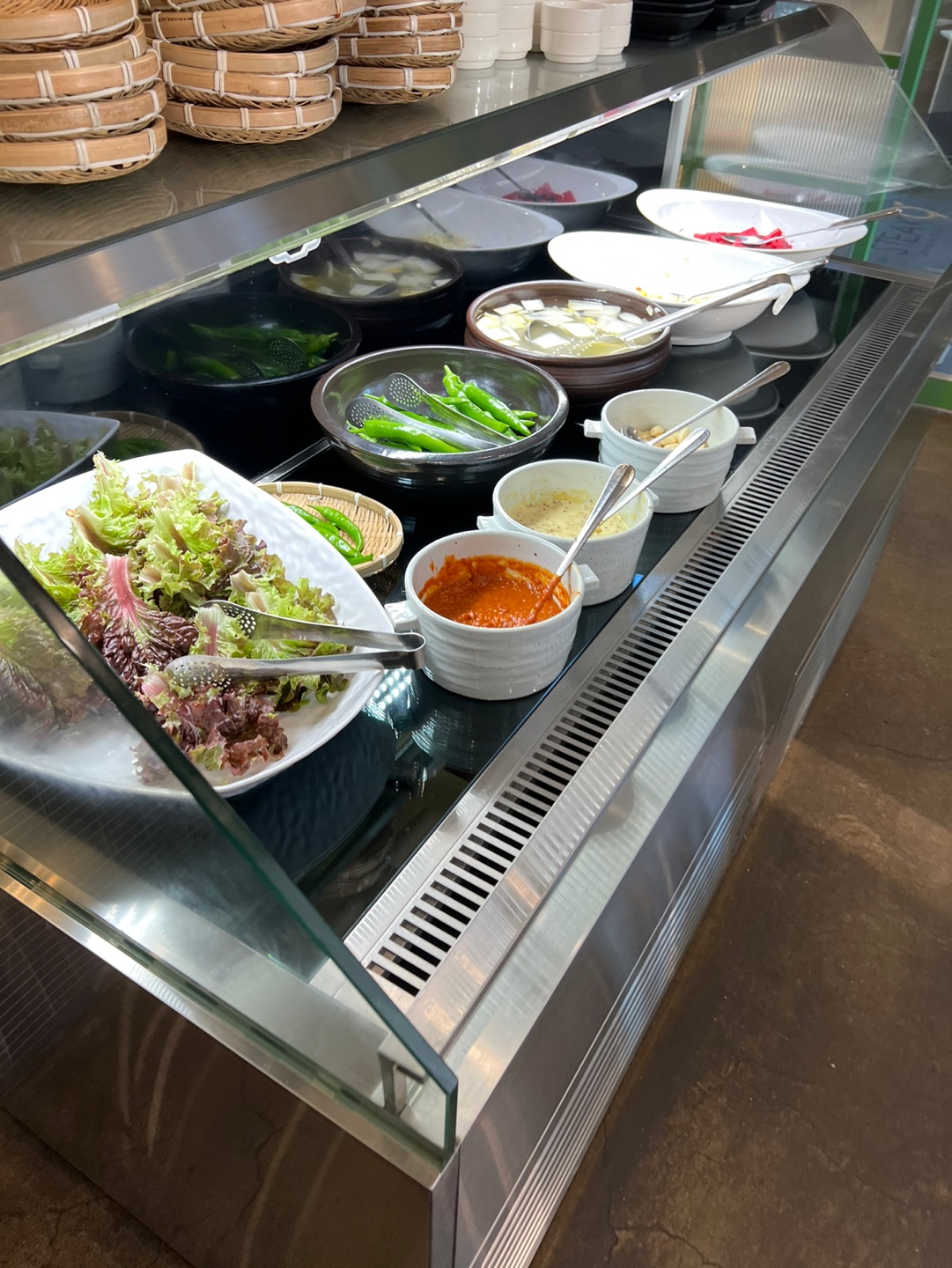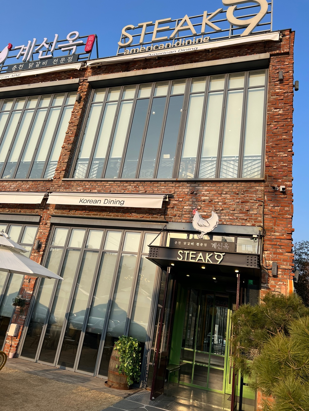 추가반찬은 셀프로 가지고 오며 되고 닭갈비는 먹을 수 있을 때까지 직원들이 익혀주니 편하게 먹을 수 있습니다. 저희는 이른 저녁시간쯤 와서 창가에 앉았는데 딱히 멋진 뷰는 없었지만 시원한 통창이라 야외에서 먹는 느낌도 들었습니다.