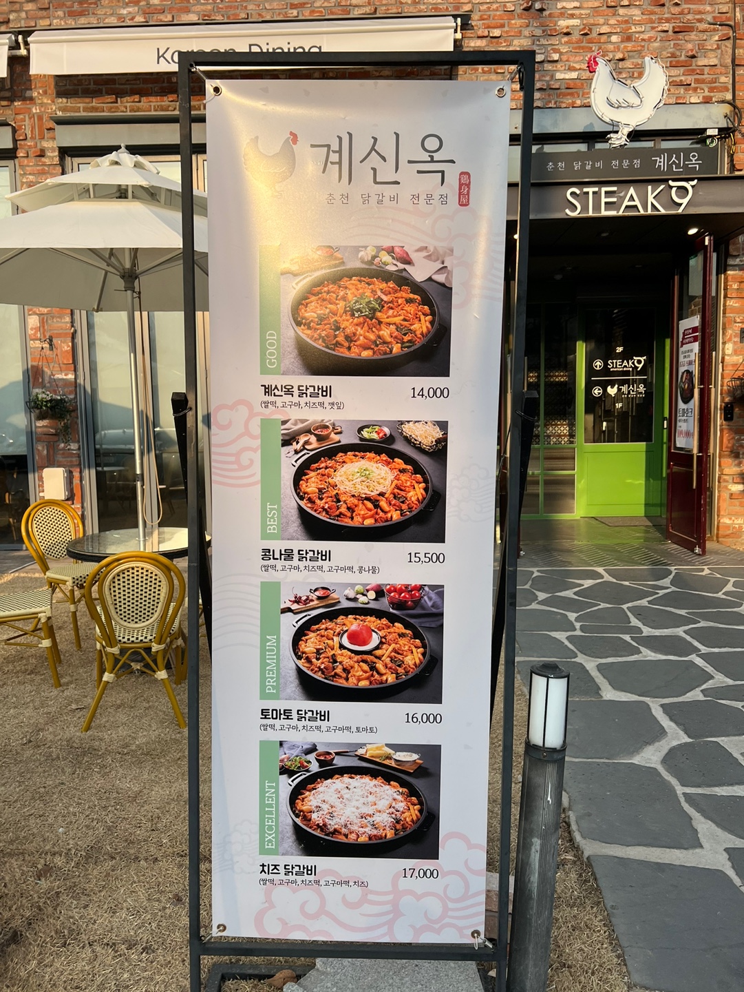 이 곳 메뉴는 사진을 참고하시면 되고 자리도 널찍하고 무엇보다 테이블이나 실내인테리어를 너무 잘해놔서 분위기도 좋았습니다. 저희는 치즈 닭갈비를 시키고 물 막국수를 시켜서 먹었는데 감자전을 못 먹고 와서 아쉬웠습니다. 하지만 감자전까지 시키면 다 남기고 올 것이 뻔하기에 다음에 먹기로 하고 닭갈비부터 다 먹어보기로 했습니다.