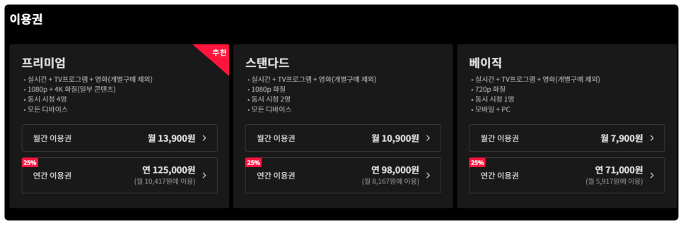 베이직은 모바일과 PC에서만 이용이 가능하며 프리미엄과 스탠다드는 어떤 디바이스에서든 시청이 가능합니다.